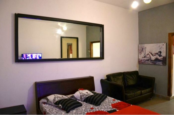 מיטה זוגית עם מצעי כותנה לצד ראי קיר ענק,